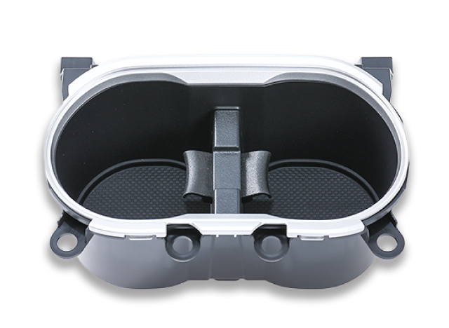 コンソールに付くドリンクホルダー部品です。中央部のフラップは、スプリングによる可動式でカップをしっかりと固定する構造となっています。