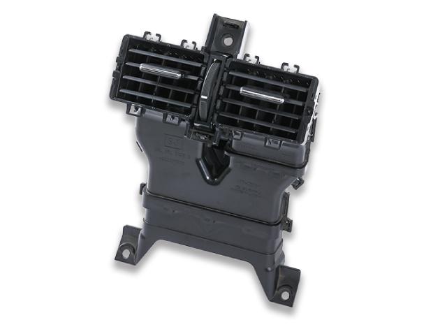 後席のエアコン吹き出し口の部品です。複数の自社成形品を自働機ラインにて製作。同一工場内で部品の成形をしているため、生産効率の良い製品です。