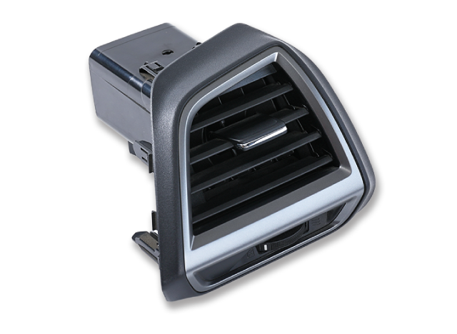 エアコンの吹き出し口をカバーする部品。シルバーの塗装を施し、高級感のある仕上がりです。成形直後に塗装が可能なので、製造ロスを低減しています。
