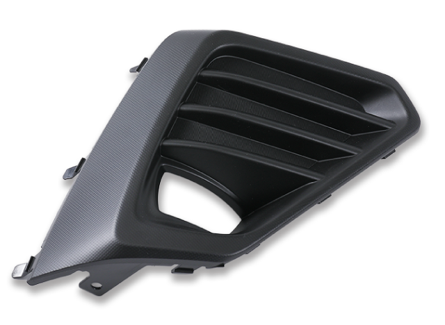 フォグランプをカバーする外装部品です。流動解析によりウエルラインを制御し、外観を向上させています。穴の有り無しを駒交換にて、1型で成形可能な製品です。