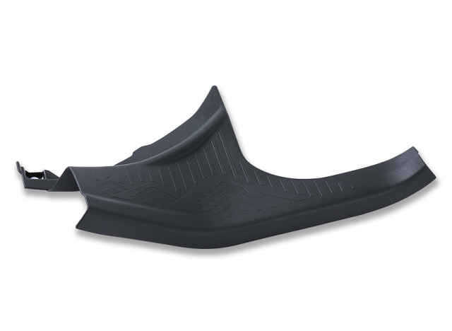後席のステップ部をカバーする内装部品です。人が踏んでも破損しないように設計されています。車に取り付けるためのクリップを成形工程で自働組付けしています。(インライン組付け)