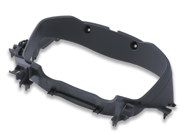 メーター類の周りに位置する内装部品。黒の艶なし塗装を施すことで光の映り込みを防止した製品となります。成形直後に塗装が可能なので、製造ロスを低減しています。