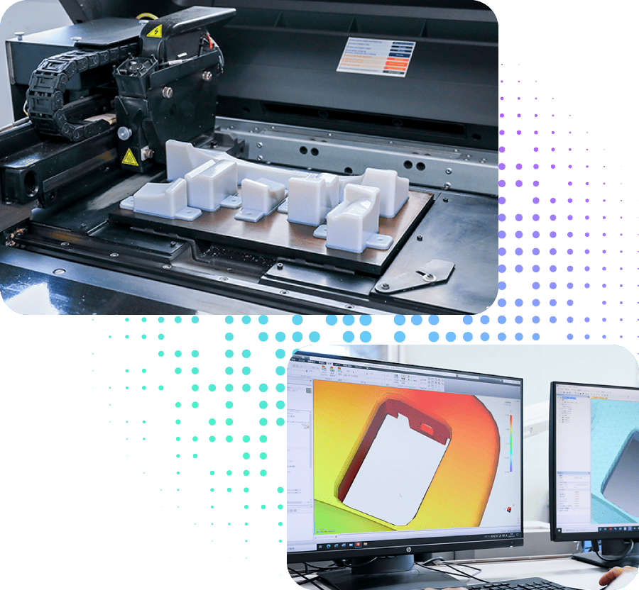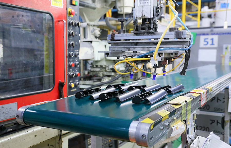 製品の開発・設計段階からお客様と二人三脚で検討し、射出成形(インジェクション)に適した製品の提案を行っています。製品完成後の不具合や強度不足といった問題を事前に回避でき、効率的な開発・生産活動を実現。成形機や金型など、生産に必要な設備も自達できるため、トライ&エラーを重ねながら品質と生産性を高め、お客様のニーズに合った設備を準備可能です。こうした設備をパートナー(協力工場)にも支給することで、約370,000個/日の納入を実現しています。