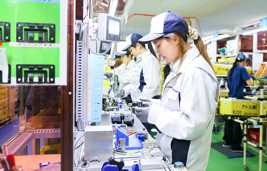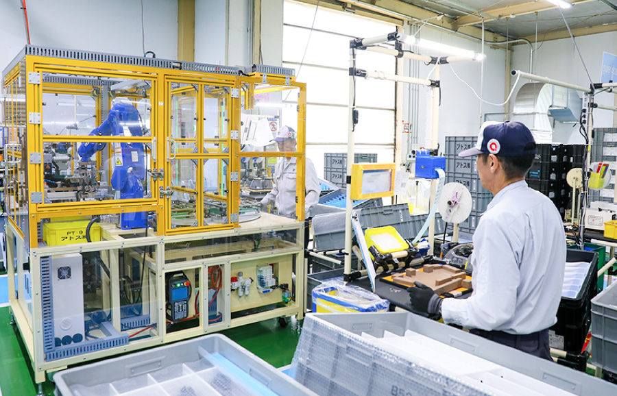 百石工場はエアコンの吹き出し口など空調部品の製造を専門に行っています。小型の成形機が揃い、1人の段取り者が15台の機械を担当。少数精鋭で組立までをこなし、作業の所要時間を1秒でも短縮できるよう、改善活動に励んでいます。安全で高品質なモノづくりを前提として、安定的な生産活動を確保するために、人材育成の強化とブランド力の向上が今後の目標です。
